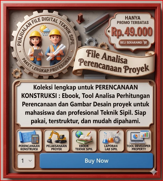 Koleksi lengkap untuk PERENCANAAN KONSTRUKSI : Ebook, Tool Analisa Perhitungan Perencanaan dan Gambar Desain proyek untuk mahasiswa dan profesional Teknik Sipil. Siap pakai, terstruktur, dan mudah dipahami.
